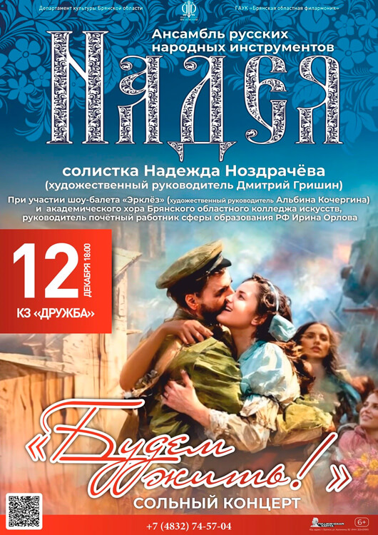 Ансамбль русских народных инструментов «Надея» (худ. руководитель Дмитрий Гришин) – это яркий, самобытный, профессиональный творческий коллектив, радующий зрителей живым звучанием русских народных инструментов, выразительной энергетикой, красотой и глубиной творчества. Программа рассказывает о непростом послевоенном времени: о том, как люди продолжали жить, любить и петь... Она наполнена патриотизмом, любовью к Родине, любовью к русской песне и народному творчеству. В концертной программе прозвучат золотые хиты ансамбля, военно-патриотические композиции и русские народные песни. В концерте также принимают участие: шоу-балет «Эрклёз» (худ. руководитель Альбина Кочергина) и академический хор Брянского областного колледжа искусств, руководитель почётный работник сферы образования РФ Ирина Орлова.