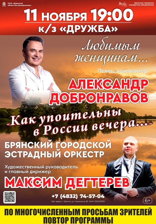 Для Вас прозвучат легендарные авторские композиции в исполнении певца и композитора Александра Добронравова, художественного руководителя и главного дирижера Максима Дегтерева и солистов: Юрия Душакова, Дарьи Гриневич, Андрея Запецкого, Алины Горецкой, Ильи Селедцова, Екатерины Волченковой, в сопровождении Брянского городского эстрадного оркестра.