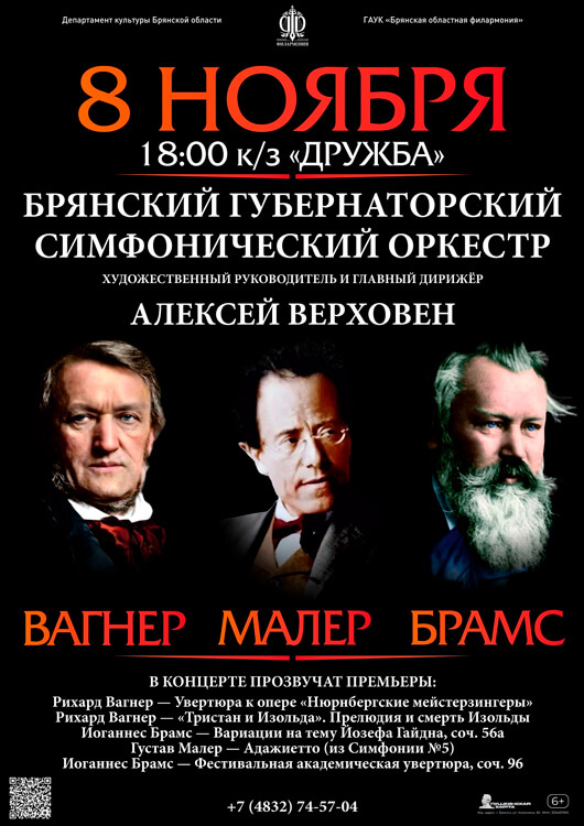 Брянская филармония приглашает на большой симфонический вечер, посвящённый выдающимся шедеврам зарубежной классики. Под управлением художественного руководителя и главного дирижёра Алексея Верховена Брянский губернаторский симфонический оркестр исполнит произведения Брамса, Малера и Вагнера — трёх композиторов, чьё творчество определило лицо музыкальной Европы XIX века.В первом отделении слушателей ждёт встреча с творчеством Иоганнеса Брамса и Густава Малера. Прозвучат блестящие «Вариации на тему Йозефа Гайдна» — одно из самых известных симфонических сочинений Брамса, пронизанное глубокой музыкальной мыслью и изяществом формы. Затем оркестр исполнит лирическое и проникновенное Адажиетто из Пятой симфонии Малера, произведение редкой красоты и духовной силы. Завершит отделение торжественная и яркая Фестивальная академическая увертюра Брамса. Второе отделение полностью посвящено Рихарду Вагнеру — реформатору музыкального театра и мастеру грандиозных симфонических полотен. Прозвучат три шедевра: величественная Увертюра к опере «Нюрнбергские мейстерзингеры», проникновенная и трагически-прекрасная Прелюдия и смерть Изольды из оперы «Тристан и Изольда», а также драматическая и мощная Увертюра к опере «Риэнци». Этот вечер станет ярким событием филармонического сезона и позволит публике прикоснуться к истинным вершинам мировой симфонической музыки.