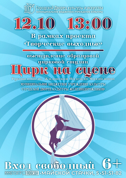 Не упустите шанс провести свои выходные ярко и незабываемо! Приходите всей семьей, с друзьями, чтобы окунуться в атмосферу волшебства и восторга, которую подарит вам коллектив Городского Дворца культуры железнодорожников - "Цирк на сцене".